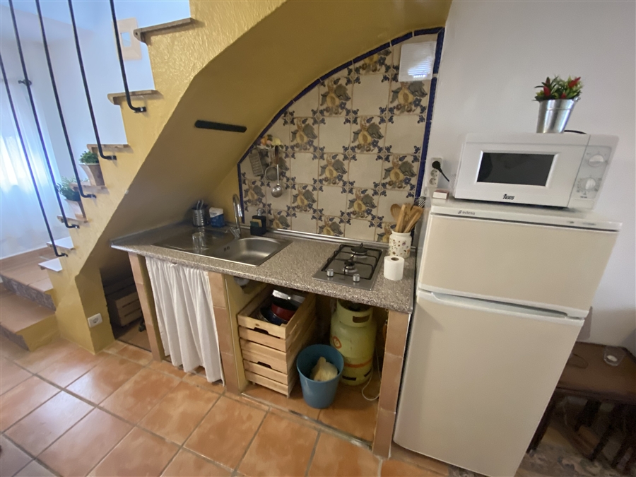 The house consists of three floors. The ground floor is a studio with a small kitchen and a bathroom. The other two floors are a two bedroom flat, with kitchen, living room with wood burning cooker and a bathroom with a large shower. Terrace with good views.