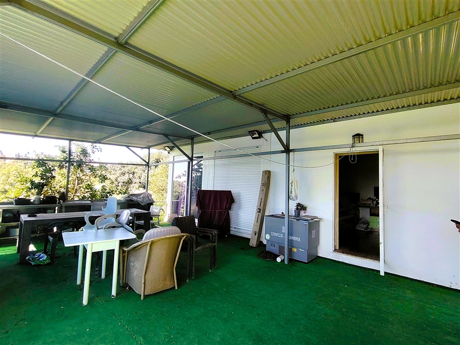 The plot is long, flat, and south-facing. It is planted with approximately 100 Hass avocado trees in full production. There are neighbors on either side, and some road noise can be heard. The existing building is registered as a warehouse, but it is actually a small, single-story house of approximately 40 m2 in perfect condition. It comprises a living area with a fully equipped open-plan kitchen, a small, relatively new bathroom with a shower, and a bedroom. The bedroom area has a door leading to the porch, as do the kitchen and living room, which have large French doors with electric blinds that also provide access to the porch, making the house very bright. The porch is approximately 60 m² and is equipped with an outdoor kitchen. Good access via a paved road, a short distance from one of the main roads in the area.